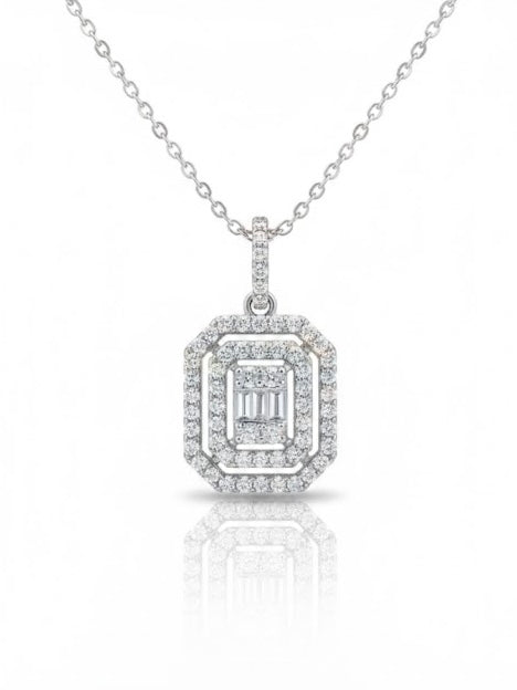 A refined octagon-halo pendant featuring a 2×4mm emerald-cut center, four 2.5mm round stones, and two halos set with 2mm round stones. A modern, sparkling design for effortless elegance.